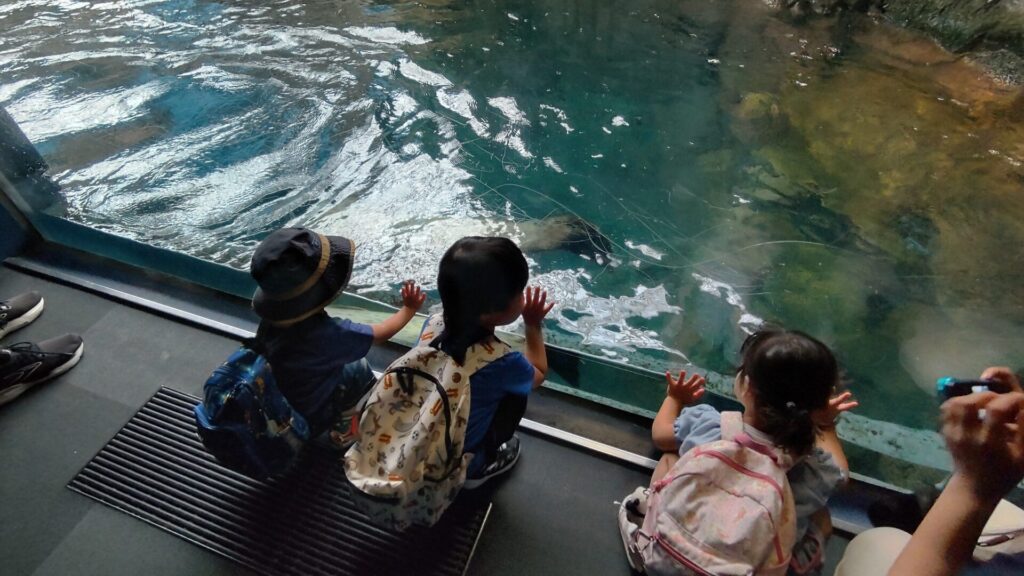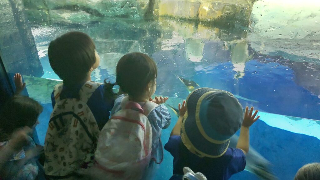 海遊館に着くと大きなお魚のモニュメントがお出迎え🐡みんな目をキラキラさせながら早く行こうと大興奮!いざお魚さんたちに会うと目を丸くする子、後ずさりして少し怖がる子、手をたたいて大喜びする子・・・・!! 普段見れない子どもたちの表情に職員もほっこり!!ほっこり!!